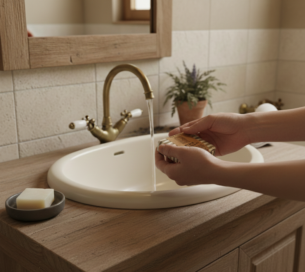 Biely povlak na povrchu mydla vzniká počas procesu sušenia a je dôsledkom tradičnej technologie.